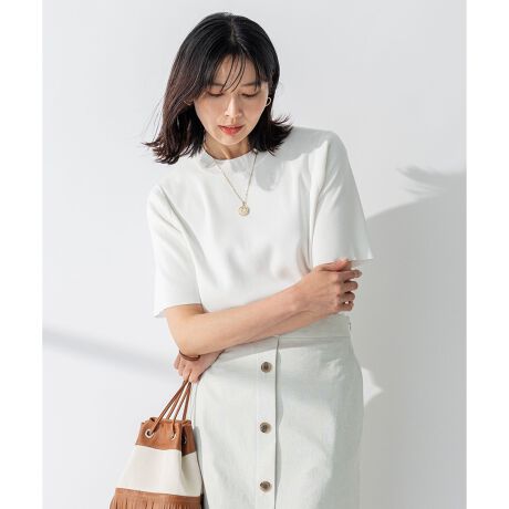丁寧に編み立てたクルーネックプルオーバー。襟はややハイネックに仕上げており、ちょっとした洒落感をプラス。1枚で着映える大人のTシャツニットです。袖は5分袖丈で、両脇にスリットを入れています。裾にリブが無いので腰回りの締め付けもなく、1枚でさらっと着用していただけます。カラーは、爽やかなホワイト(#001)、クールなブラック(#005)、肌なじみの良いベージュ(#033)、今年イチオシのブルー(#070)の4色展開です。