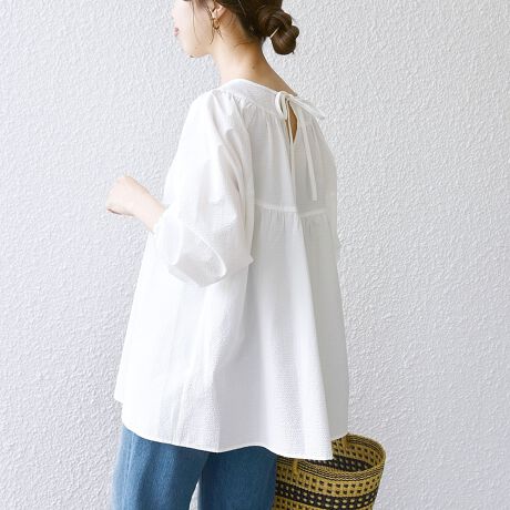 軽やかなサッカー素材で清涼感があり、袖が少し長めなので冷房や紫外線除けにもなって◎