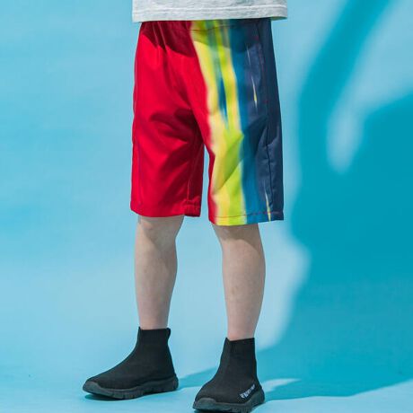 海岸に並ぶ色とりどりのサーフボードをイメージしたカラフルなグラデーションプリントがインパクト抜群の5分丈ハーフパンツ。