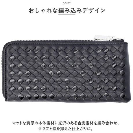 Legato Largoから、編み込みデザインが目を惹く長財布が登場。【おしゃれな編み込みデザイン】マットな質感の本体素材に光沢のある合皮素材を編み合わせ、クラフト感を抑えた仕上がりに。【ファスナー開口】開口部はL字ファスナー式。横に大きく開いて、出し入れラクラク。【仕分けできるフリーポケット】4つのフリーポケットはお札、レシートや領収書などの仕分けに便利。【小銭入れとして活躍】中央のファスナーポケットは小銭入れに最適。大きめのつくりで中身が見やすく、お会計もスムーズ。【充実のカードポケット仕様】12個のカードポケット付き。クレジットカードやポイントカードなどをすっきりと整理整頓♪【アクセントをプラス】ゴールドやシルバーの金具使いもポイント。(※カラーにより金具の色が異なります。)【ポケット仕様】内側:フリーポケット×4、ファスナーポケット×1、カードポケット×12