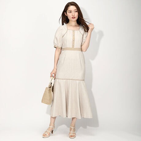 ふんわりとしたパフスリーブと、裾フレアなマーメイドラインがエレガントな女性らしさを演出。