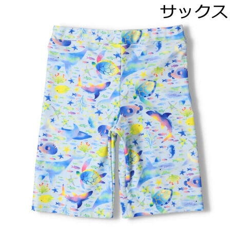 スイミング、プール、海水浴、水遊び、夏に大活躍の水着、スイムウェア。海水パンツ、スイムパンツ、サーフパンツ。UVカット加工生地を使っています。夏らしいカラフルな海の生き物の総柄。【アイテム】雑貨 カジュアル お洒落 オシャレ かっこいい かわいい 可愛い 普段着 デイリーウェア お出かけ 子ども こども 男児 男の子 ボーイズ キッズ ベビーサイズ トドラーサイズ 幼稚園 保育園 小学校 小学生 旅行 2022年夏物新作 丸高衣料 ブルー サックス 青色 水色 キッズフォーレ お魚 さかな くじら クジラ サメ 亀