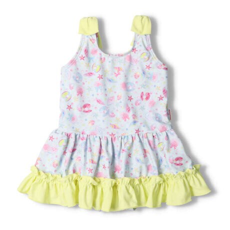スイミング、プール、海水浴、水遊び、夏に大活躍の水着、スイムウェア。スカート付きのワンピースタイプ。UVカット加工生地を使っています。夏らしいシェルの総柄。肩のリボンや裾のフリルデザインが女の子らしいポイント!【アイテム】雑貨 カジュアル お洒落 オシャレ かっこいい かわいい 可愛い 普段着 デイリーウェア お出かけ 子ども こども 女児 女の子 ガールズ キッズ ベビーサイズ トドラーサイズ 幼稚園 保育園 小学校 小学生 旅行 2023年夏物新作 丸高衣料 キッズフォーレ ラベンダー 薄紫色 サックス 水色 貝殻