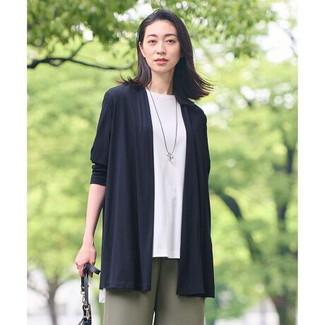 ■デザイン定番人気のロング丈カーディガン。縦目のストライプラインにより縦のラインが強調され、全体的にすっきりときれい見えするシンプルなデザインです。ヒップが隠れるロング丈は、パンツと相性が良く、サイドのスリットが抜け感を演出してくれます。コンパクトで気軽にさっと羽織れる上、軽くて薄手なので持ち運びにも便利で、気温差のある日や冷房対策に欠かせない1枚です。