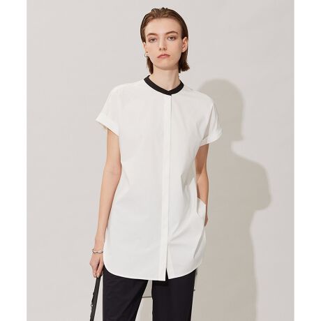 ■デザイン夏に向けて活躍する、チュニック丈のカットソーです。前身頃は布帛素材、ヨーク・後身頃はカットソー素材のコンビで、サラッとした着心地と動きやすいストレッチ性のある素材感が両方感じられるデザインです。ジャケットのインナーとしても、一枚でも決まるすっきりとしたシルエットで、パンツスタイルにおすすめのカットソーです。衿の配色カラーは、オフホワイト(002)、ブラック(005)、オリーブ(054)はブラック、セルリアン(071)はネイビーとなっています。