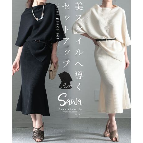 美スタイルに導くセットアップです。ドルマントップス、マーメイドスカートにベルトの3点セット。絶妙なシルエットが着るだけでスタイルアップに導いてくれます。