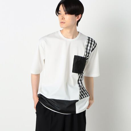 シアー素材をコンビ使いしたデザインクルーネックTシャツです。