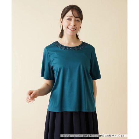 ネックラインにエキゾチックな雰囲気のスパンコールをあしらった半袖Tシャツ。シンプルなワントーンにまとめることで着回し力を高めています。生地はほのかに光沢のあるシルキーな素材を使用しており、大人の女性らしい上品な風合いに仕上げました。バックネックにはボタン留めの涙あきを施しています。------------------------------------初夏あり色によりありなしやや薄手ウォッシャブル(手洗い可)-------------------------------------※商品の色味は、撮影場所や光のあたり具合、お客様のお使いの機器により色味が違って見える場合がございます。予めご了承ください。※定価(税込)は、2023年06月29日のセール開始前の店舗における販売価格です。 ■□Leilian WHITE LABEL(ホワイトレーベル)・・・実力派デザイナーとの協業で、ベーシックな商品によりトレンド性を取り入れたブランドです。□■