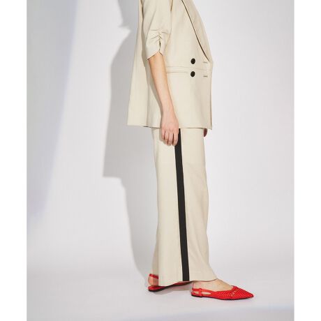リネン調のオックス素材でお作りした、ナチュラルな風合いのワイドパンツ。サイドのウエスト脇に控えめなカットアウトテクニックを入れた、技ありデザインです。サイドに太めのラインを入れて、ほんのりスポーティーなムード薫る一本に仕上げました。もたつき感がなくルーズになり過ぎない絶妙なシルエットに拘り、大人の女性が品良く穿けるように。定番として使えるブラックとベージュをご用意。セットアップで着用できるテーラージャケットとのコーディネートもおすすめです。