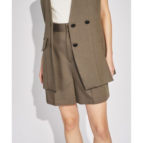 スラブ麻調合繊素材でお作りした、ナチュラルな表情が魅力のハーフパンツ。膝上丈ですが、タックとセンタープレスを入れて、幼く見えないように綺麗にめに仕上げた一本です。股上深めでスタイルアップにもなり、同時に安心感のある穿き心地を両立。お揃いのベストを合わせたセットアップスタイルがおすすめです。