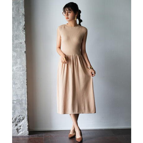 トップス部分がリブ編み、スカート部分がハイゲージ網になった編み地の切り替えが目立つデザインです。一枚でセンスの良さをアピールできます。ノースリーブのようなフレンチスリーブが女性らしいイメージをつくります。