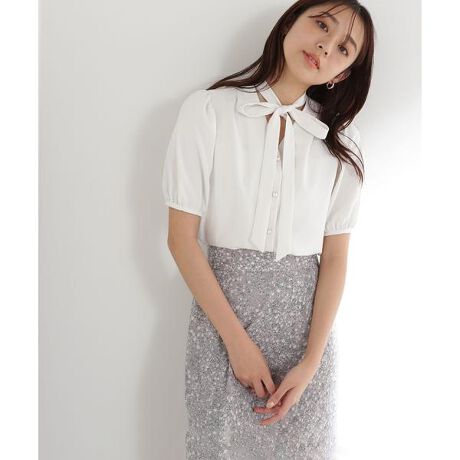 [design & styling]パール釦とリボンディテールが女性らしいデザインブラウス。ボウタイは前でリボン結びにしてボウリボンとしても、後ろに回してチョーカーネック風にも着られる2way仕様なので着回し力も◎パールボタンは一番下をフラットなボタンにしているので、ボトムスINしたときでも、パールのシルエットであたりが出ないようになっています。フェミニンなマーメイドスカートなどはもちろん、ワイド系のパンツをあわせても、大人っぽくエレガンスムードで着ていただけます。ボタンはすべて開けることができます。[fabric]エレガンスなスタイルにもはまるポリエステル素材を使用しています。※モデルの着用画像の場合、光の当たり具合により、実際の色味と異なって見えることがございます。色味は、商品単体の画像をご参照ください。
