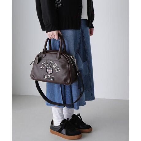 ビンテージ調の配色で統一感のあるワッペンと、レザージャケットよりインスパイアされたバーシティーロゴが印象的なミニボストンバッグ