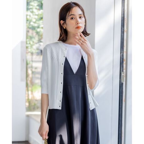 シンプルなシルエットに編み柄が映える、前後着用可能な万能ニットカーディガン
