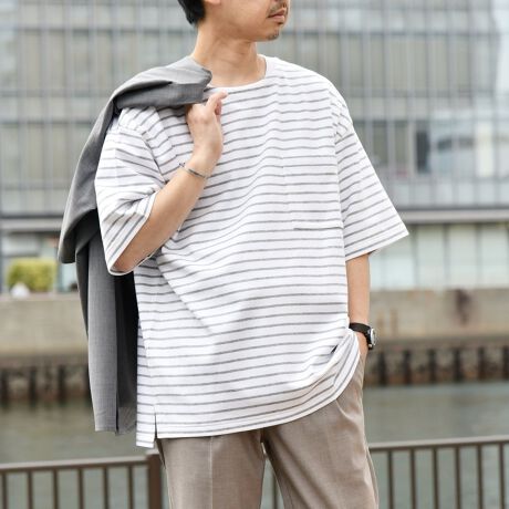 SHIPS any: ボートネック タフ Tシャツ〈ボーダー/単色〉◇