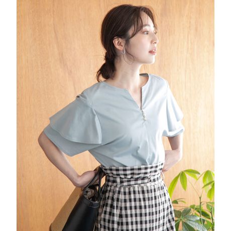 【接触冷感・洗える】キーネックフレアー袖シルケットプルオーバー