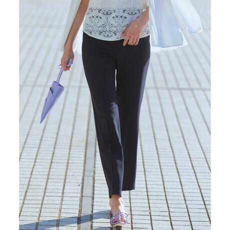 1本あると大活躍のスタイリッシュなテーパードパンツ。どんなトップスにも合わせやすく、オフィスでもデイリーにも万能に活躍できるアイテムです。ウエストの後ろにはゴムで伸縮性を持たせ、ストレスのない履き心地です。同シリーズのジャケットとキレイ目セットアップで着たり、単品使いでブラウスと合わせても着られる、着回し抜群のパンツです。素材の着やすさもあり、長い期間楽しんでいただけます。展開カラーは、女性らしく柔らかい色味のベージュ(#033)、洗練された印象のネイビー(#075)の2色展開です。