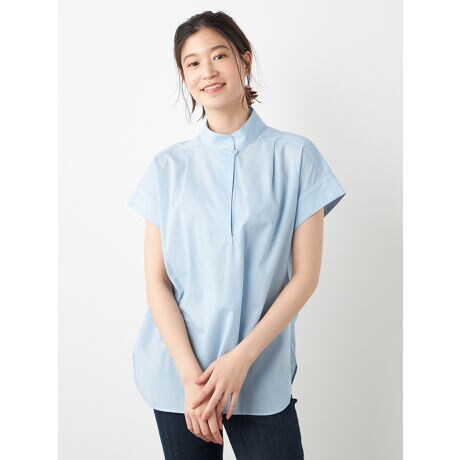 薄手のローン素材でオフホワイトとブルーの爽やかなカラー展開。前身ごろはシンプルなタックデザイン、後ろ身頃にギャザー切り替えを入れて、エアリーな素材感を活かしたゆったりシルエットのプルオーバーブラウス。脇スリットと身頃の前後差が、1枚でも着合わせやすいデザインディティール。デニムパンツと合わせた爽やかなスタイリングがおすすめです。