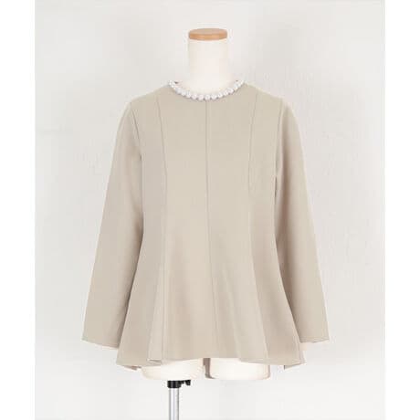 襟元にあしらった大きめのホワイトパールがこだわりのヘムライントップス。