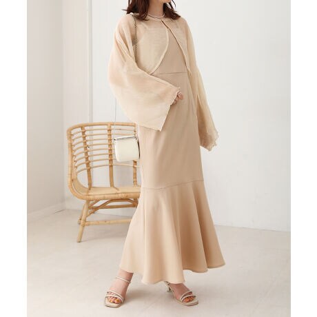ボレロとセットになったキャミワンピースが新登場。キャミワンピースは裾に向かって広がるフレアシルエットで、体のラインを綺麗に見せてくれます。また、付属のリボンを肩で結びつけると大人カワイイ1着に仕上がります。さらに透け感のあるボレロを羽織るとお呼ばれワンピースに大変身。ボレロは前後2WAYにもなっていて、1着だけで様々な着こなしを楽しめるアイテムとなっております。