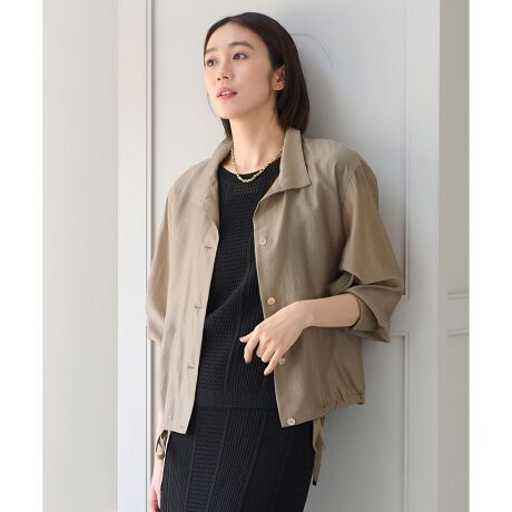 初夏に持っておきたいシアーブルゾン■デザインスタンドカラーのシアーブルゾンです。お顔周りが華やかに見える程よいスタンドカラーデザインで、大きめのアームホールが今年らしい抜け感を感じられるシルエットです。トレンドのボリュームスリーブトップスの上からでも羽織って頂けます。裾は内側から紐で絞ることができます。しなやかで、軽く、持ち歩いてもシワになりにくいアイテムです。■素材トレンドのシアー感のある素材です。ハリ感を抑えめにし、やや光沢感がある滑らかな風合いに仕上げました。肌離れが良く、汗が乾きやすく蒸れにくい、初夏に適した素材です。