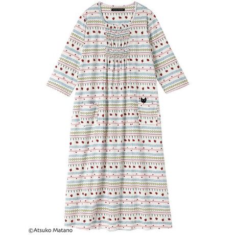【ワンピース(7分袖)】クリエーター“俣野温子”氏がデザインする、甘くなりすぎない大人かわいいテキスタイルとカラーで、くつろぎ時間を楽しく過ごせるパジャマ&ルームウェア少しフシの見える生地感が特徴の、やさしい肌ざわりの天竺素材です。いちごやフリルなどボーダー調の柄をプリントしたかわいいテキスタイル。ポケットから顔をのぞかせている黒猫のアップリケがデザインのポイント。※アイテムによって柄の出方が異なりますのでご了承ください。【サイズ詳細】M:バスト107.0cm 着丈110.0cmL:バスト115.0cm 着丈110.0cmLL:バスト123.0cm 着丈111.0cm※出来上がり寸法を表示しております。※サイズ詳細の寸法には多少の差異がございます。