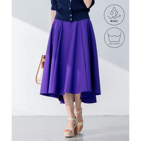 ■デザイン太めのデザインヨークがウエストをすっきりとみせ、長めの着丈感が女性らしいタックフレアスカートです。前後で着丈に変化をつけ、裾にかけて広がりのあるシルエットにしています。広めにとった裾の切り替えがシンプルなデザインのアクセントになっています。後ろウエストは部分的にゴム仕様にしているので着心地の良さも嬉しいポイントです。