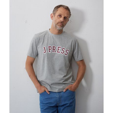 カレッジライクなロゴTシャツ■素材MVS天竺は毛羽が極めて少ないので、着心地の良い滑らかな肌触りをしています。MVS天竺の最大の強み。それは“摩耗に強い”ということです。毛玉の原因ともなる毛羽がそもそも少ないため着用を繰り返しても毛玉ができにくく、さらに糸の特殊構造によって洗濯をしても型崩れしにくいという特長も持っています。摩耗に強い生地なのでご自宅でも気軽にケアができるという点が、MVS天竺を使用したアイテムの大きなメリットです。その他にも吸水性が高い、乾きやすい、といった特長も持っています。■シルエットJ.PRESSのレギュラーフィットで汎用性の高いサイズ感。■仕様胸ロゴをアメリカのヴィンテージで見られる様なファブリックを使用した、布帛の生地でロゴを模り、振りミシンで周りを縫い付ける手法で表現しています。■コーディネート夏場は勿論一枚でも、春先はジャケットインにしてもコーディネート頂けると思います。■デザイナーコメント清涼感のある天竺素材と特徴的的な手法で縫い付けられたロゴを是非お楽しみ下さい。