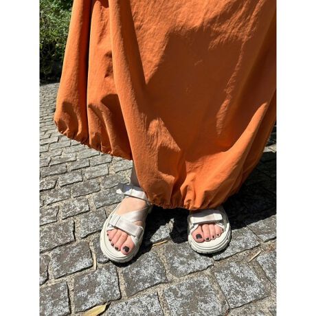 存在感のあるシートベルトタイプのストラップに、見た目にもポイントになるコマンドソールに着想を得たブロックパターンのSFソールでボリューム感を持たせた1足に仕上がっています。