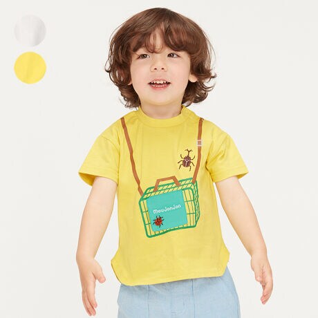 人気の虫かごデザインTシャツ。虫かごのふたをめくるとカマキリが出てくる楽しい仕掛け付き。てんとう虫とカブトムシも刺繍になっています。夏休みが楽しくなりそうな半袖Tシャツ。(ベビーサイズのみ肩ボタン仕様になります。)【アイテム】トップス カジュアル お洒落 オシャレ かっこいい かわいい 可愛い 普段着 デイリーウェア お出かけ着 お外着 お外遊び着 子ども服 こども服 男児 男の子 ボーイズ キッズ ベビーサイズ トドラーサイズ 幼稚園 保育園 小学校 通園 通学 小学生 2023年夏物新作 丸高衣料 半袖 コットン100% 綿100% ホワイト 白色 イエロー 黄色