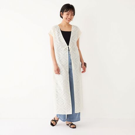 カットソーやタンクトップの上に羽織ったり、ワンピースと合わせたり、前のリボンは結んでも外してもお使いいただけます。
