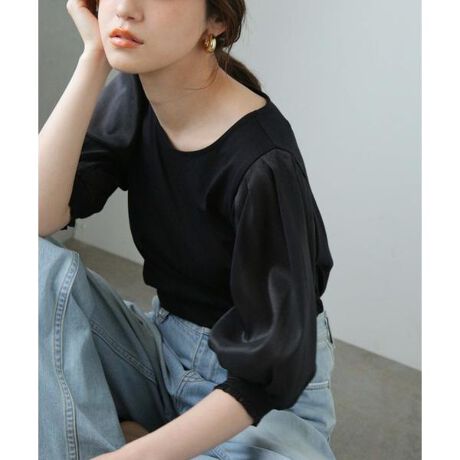 程よいシアー感とボリュームスリーブが目を惹くカットソー。背面に装飾されたパール釦や、袖口のギャザーデザインが上品見えのポイント。合わせるボトムスでカジュアルにもきれいめにも演出してくれるので、ワードローブにあると嬉しい一着です。