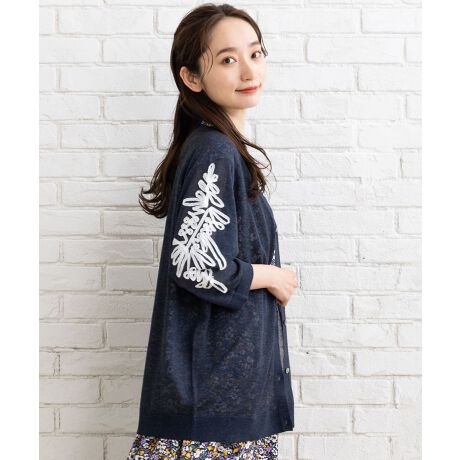 シンプルな中に個性が光るフラワーコード刺繍カーディガン。