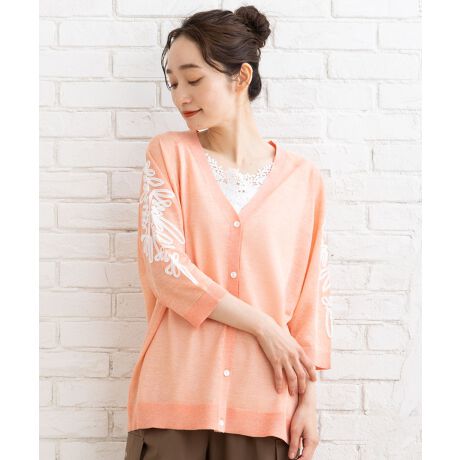 シンプルな中に個性が光るフラワーコード刺繍カーディガン。