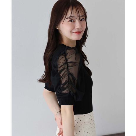 透け感のあるパフスリーブとサマーニットをドッキングした異素材コンビトップス