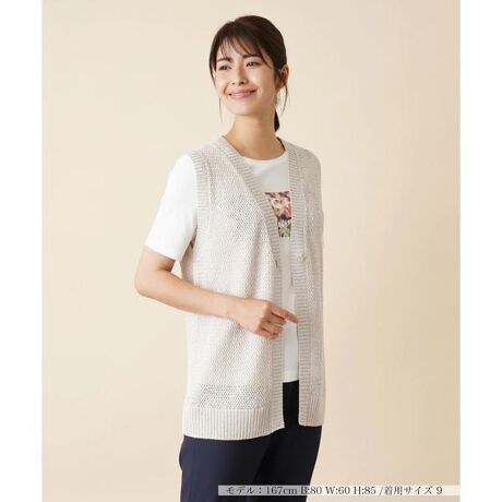 細かなメッシュ調の透かし編みが涼やかな着心地をもたらしてくれるニットベスト。コットン100%のさらりとした風合いが心地よく、シンプルなカットソーやブラウスとのレイヤードスタイルで活躍してくれそう。深めのVネックにワンボタンをあしらったカジュアルに着回しやすいデザインとなっており、フロントはボタン開閉が可能。------------------------------------夏ありありなしやや薄手-------------------------------------※商品の色味は、撮影場所や光のあたり具合、お客様のお使いの機器により色味が違って見える場合がございます。予めご了承ください。※定価(税込)は、2023年06月29日のセール開始前の店舗における販売価格です。