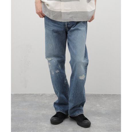 ウエストがフリンジ仕様になったヴィンテージ加工を施したデニムパンツ。