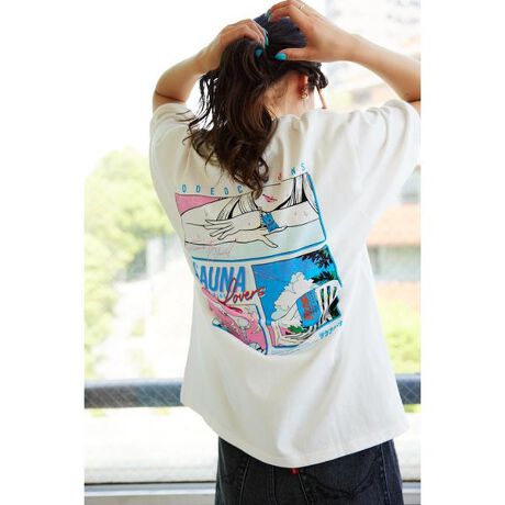 若者やサウナーに大人気のサウナボーイコラボTシャツ。バックには水風呂、サウナ、外気浴のサウナの一連の流れを80’s風のグラフィックで表現。トレンド感のある色使いが目を惹くデザインです。MとLサイズ展開でユニセックスで着用できます。