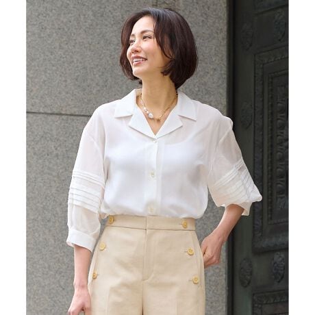 大人な抜け感と涼しげな表情が魅力のオープンカラーブラウス■デザイン肩の力を抜いた堅苦しくないオープンカラーブラウスです。程よくネック周りが開いているので、シャツ襟のような堅苦しい締め付けがなく、夏まで涼しく着て頂けます。タックをふんだんに施したソフトパフスリーブは、丸みのあるシルエットが女性らしいポイント。肘が隠れる長めの半袖なので二の腕も気にせず着て頂けます。袖口のカフス周りも大きめにサイズ取っているので、風通しが良く涼しく着て頂けます。パンツにもスカートにも合わせやすく、インでもアウトでもサマになるので、着回しやすいブラウスです。■素材トリアセテートと、環境に配慮したリヨセル糸を使用しております。打ち込みの甘いタイプライターで、しなやかで清涼感があります。