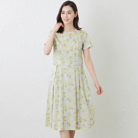 タックを入れつつもウエスト周りがすっきりと見えるシルエットに拘りました。ウエストにはプリントと同色の無地のパイピングを効かせて上品なアクセントをプラスしました。