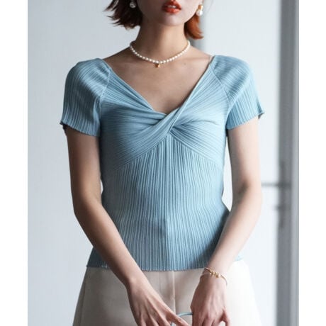 フロントツイストがポイントになった女性らしいデザインの接触冷感素材ニットです。