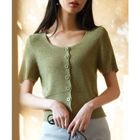 レイヤードでも一枚でも使える上品なショート丈半袖ニットカーディガンです。
