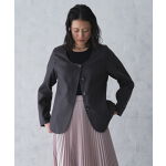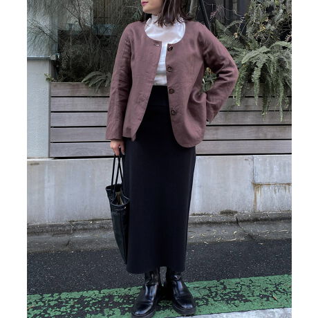 首元からシャツやハイネックのインナーを覗かせたレイヤードコーデも映えるノーカラーデザイン。