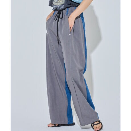 程よく落ち感のあるスラックス生地とデニム生地をドッキングした、前後で見え方の異なるドッキングパンツ。