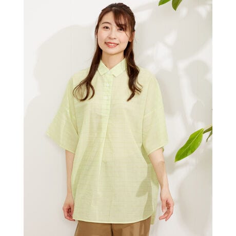 ウィンドウペンのチェック柄がクラシックなチュニックブラウス。ゆったりしたシルエットのドロップショルダーデザイン。肘までかくれる五分袖、腰回りまでカバーしてくれる75cm丈が、パサっと着れる気軽さが便利な一枚です。