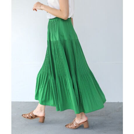 少し光沢感のあるプリーツがどこかリゾート感も漂い、コーデに立体感を持たせてくれるのでスタイルアップが叶います。