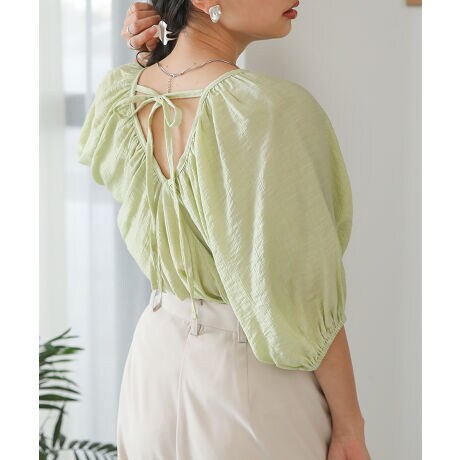 真夏でも涼しく着用できるシワ加工素材のブラウス。袖のボリューム感にとことんこだわり、ギャザーを細かく寄せることで着映えする1着に仕上げています。また、Vネックにすることでデコルテラインも美しく見せてくれるブラウスです。