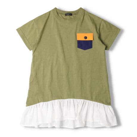 バックプリントがポイント!異素材で配色の胸のポケットはダディらしいアウトドアなイメージ。裾はフリルで女の子らしい。半袖のTシャツ素材のワンピース。(ベビーサイズのみ肩ボタン仕様になります。)【アイテム】半袖 トップス シンプル ガーリー フェミニン カジュアル お洒落 オシャレ かわいい 可愛い 普段着 デイリーウェア お出かけ着 お外着 お外遊び着 子ども こども 女児 女の子 ガールズ キッズ ベビーサイズ トドラーサイズ 幼稚園 保育園 小学校 通園 通学 小学生 2023年夏物新作 丸高衣料 ブラック 黒色 グリーン 緑色 ダディオダディ コットン100% 綿100%