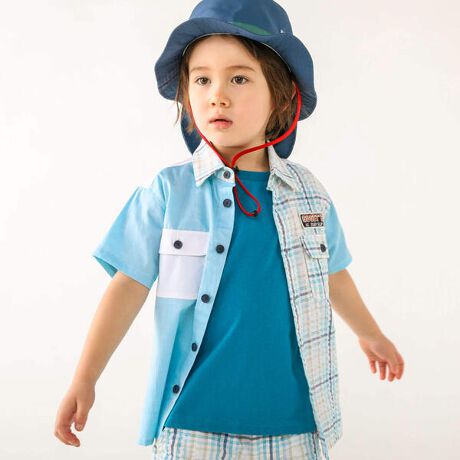 【お揃い】チェック柄切り替えバックプリント半袖シャツ(80~130cm)