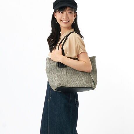 ワイドなハンドルと本体の切替デザインがポイントの2WAYトートバッグを、爽やかな季節素材で仕上げました。
